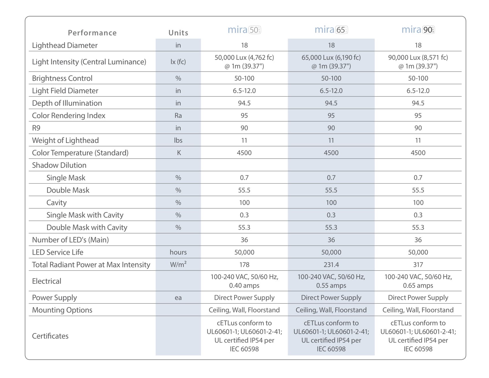 The Mira Series LED Exam lights are available in 50,000, 65,000, and 90,000 Lux options and offer a CRI of 95+ for advanced color accuracy.